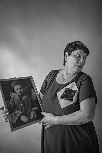 Madame Susanna Aleksanova investie dans sa communauté assyro-chaldéenne présente le portrait de Mar Shemun XIX Benyamin patriarche de l'église assyrienne assassiné en 1918 par le chef kurde Simko, Arzeni, Arménie 2021